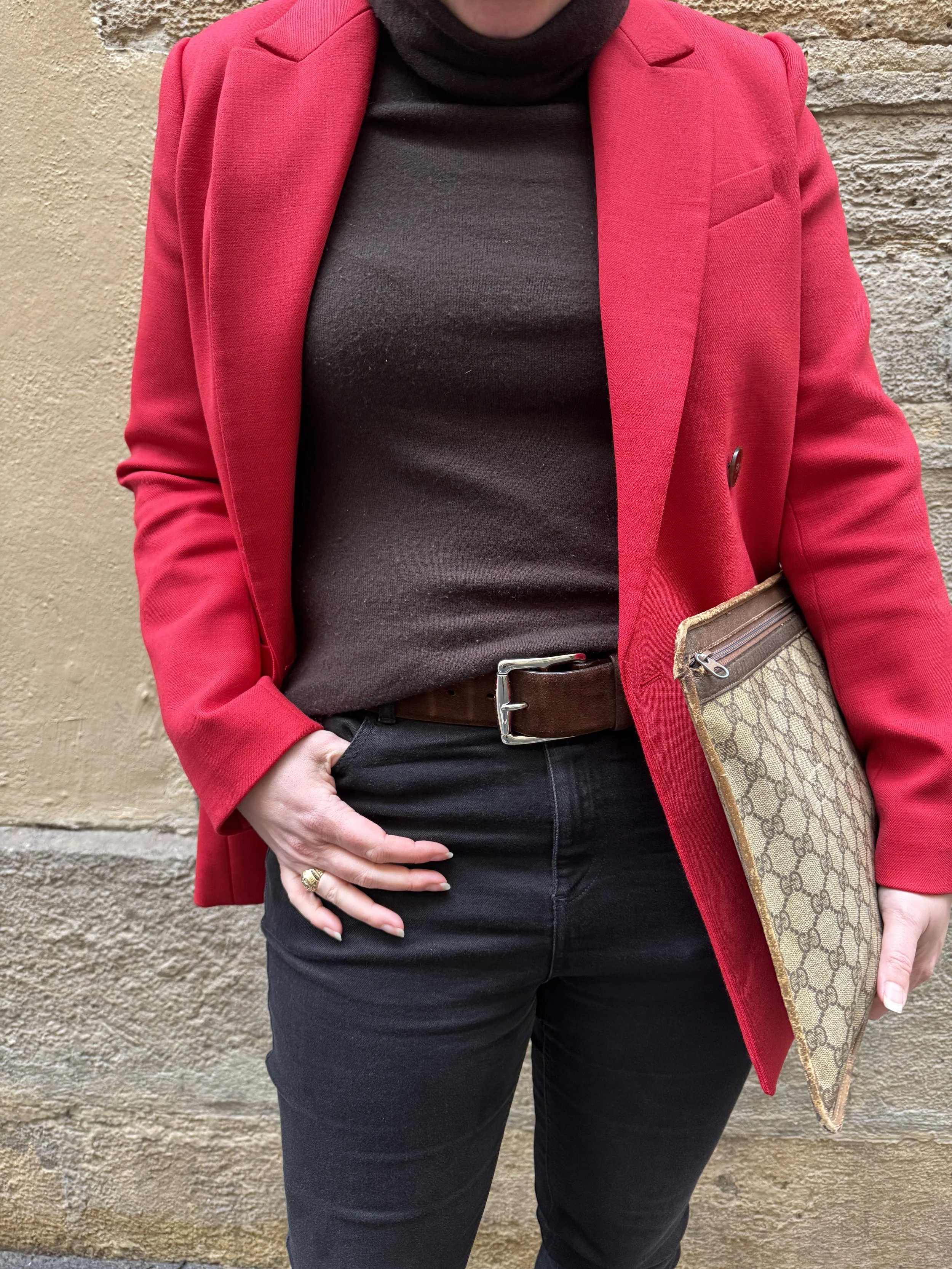 The above outfit was a testimony to how warm it was that particular week in January - black, chocolate and this jacket made for an easy formula you can easily replicate. The chocolate sweater and accessories add some depth to black skinny jeans. It’s only a slight tweak from the all-black color palette from the Rodin photo that makes this daytime outfit have interest, as well. I love this red jacket as a solid “topper” like this instead of trying to incorporate some color in another way - it’s already an outfit by itself! Meeting a new friend for a coffee in the Marais and then later a working session required my large and quite durable vintage Gucci envelope bag - fits my iPad, notebook, and essentials! I have had this particular bag for 15+ years and has stood the test of wear and tear; it is one of my favorite eBay purchases.