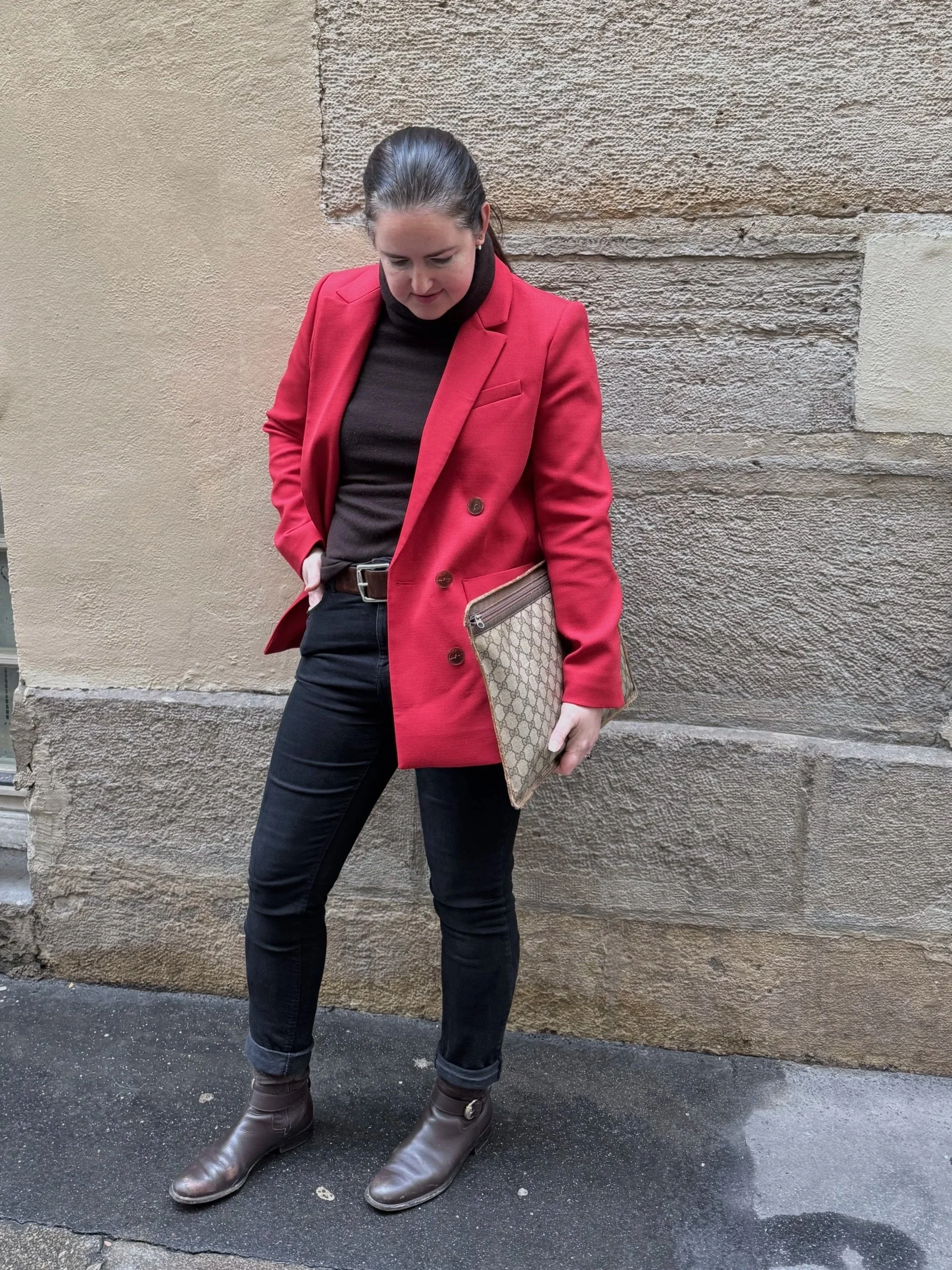 So many people love color, especially in Paris - red is a favorite choice for both men and women alike. I see it represented in outerwear, socks, bags, scarves, and throughout patterns. A little red makes the grey days of winter seem palatable! While a red little crossbody bag or a pair of red plaid socks are much easier to incorporate, I want to demonstrate a couple of ways to easily wear a more bold piece, like this Sézane Michelle blazer.