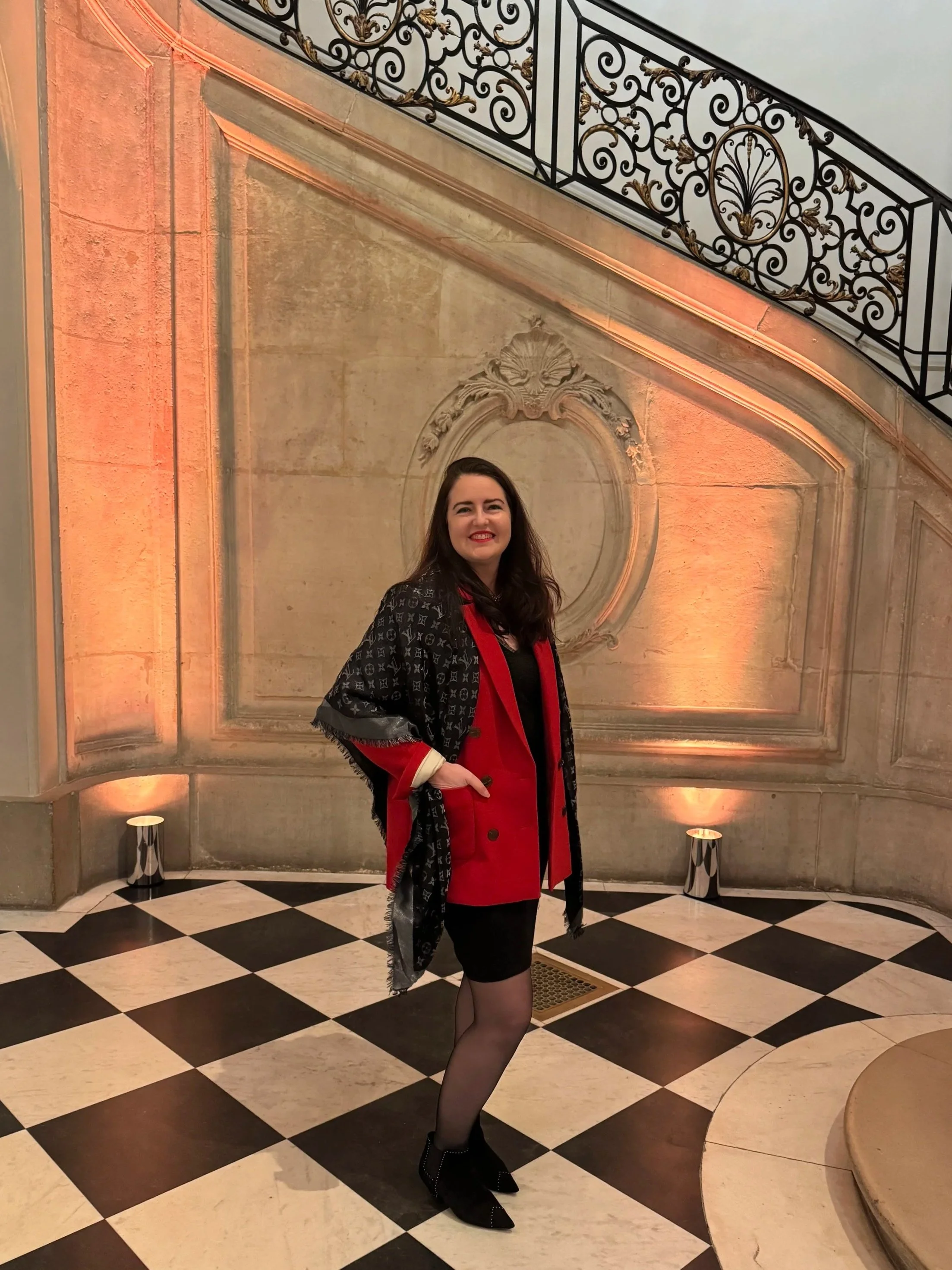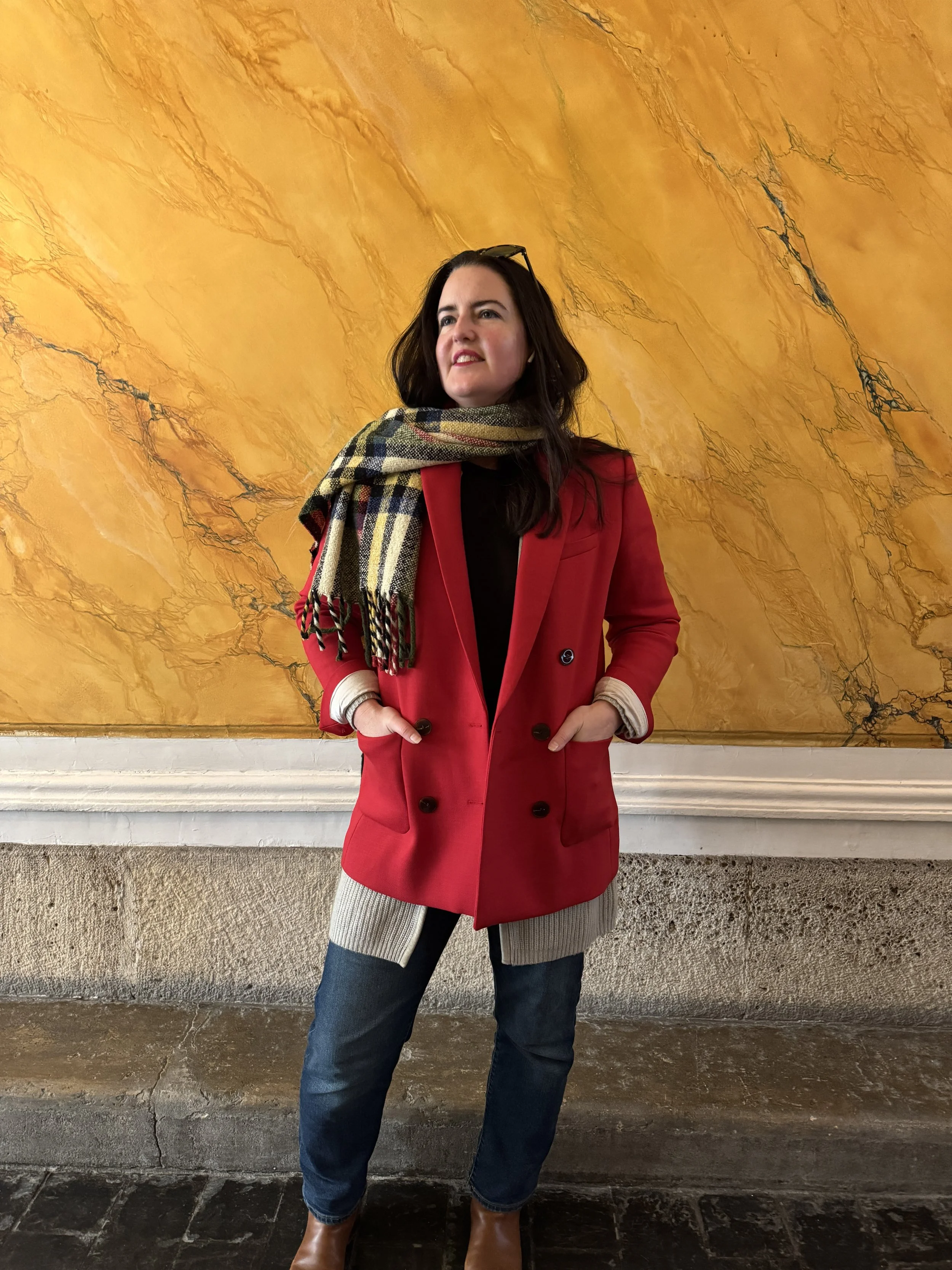 Finally, I grabbed this blazer to throw on over this neutrals-based outfit and incorporated a big plaid scarf. Denim, tan accessories, black t-shirt, and light grey long textured sweater all become harmonious and given that extra oomph with the addition of the red. I am always inspired by the women I see here consistently pushing the boundaries with color and texture. The takeaway I’m driving at is truly to not overthink - make a fun color like red (in your preferred shade, of course!) a staple in your wardrobe, because - why not? This could be easily packed for winter or spring in Paris. Life is too short, just wear the clothes!